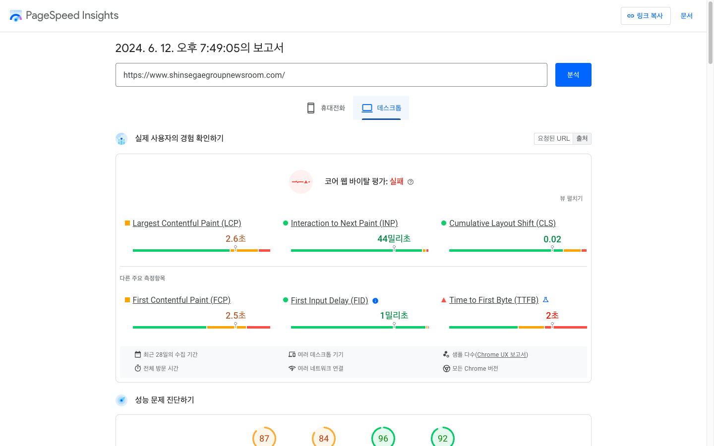 Google 페이지 스피드 분석 결과, 모바일 버전의 코어 웹 바이탈 평가에서는 통과하였고, 모바일 LCP(최대 콘텐츠 표시 시간)는 2.3초로 양호한 수준을 보였습니다. 반면, 데스크탑 버전의 코어 웹 바이탈 평가에서는 실패하였으며, 데스크탑 LCP는 2.6초로 개선이 필요한 상황입니다.