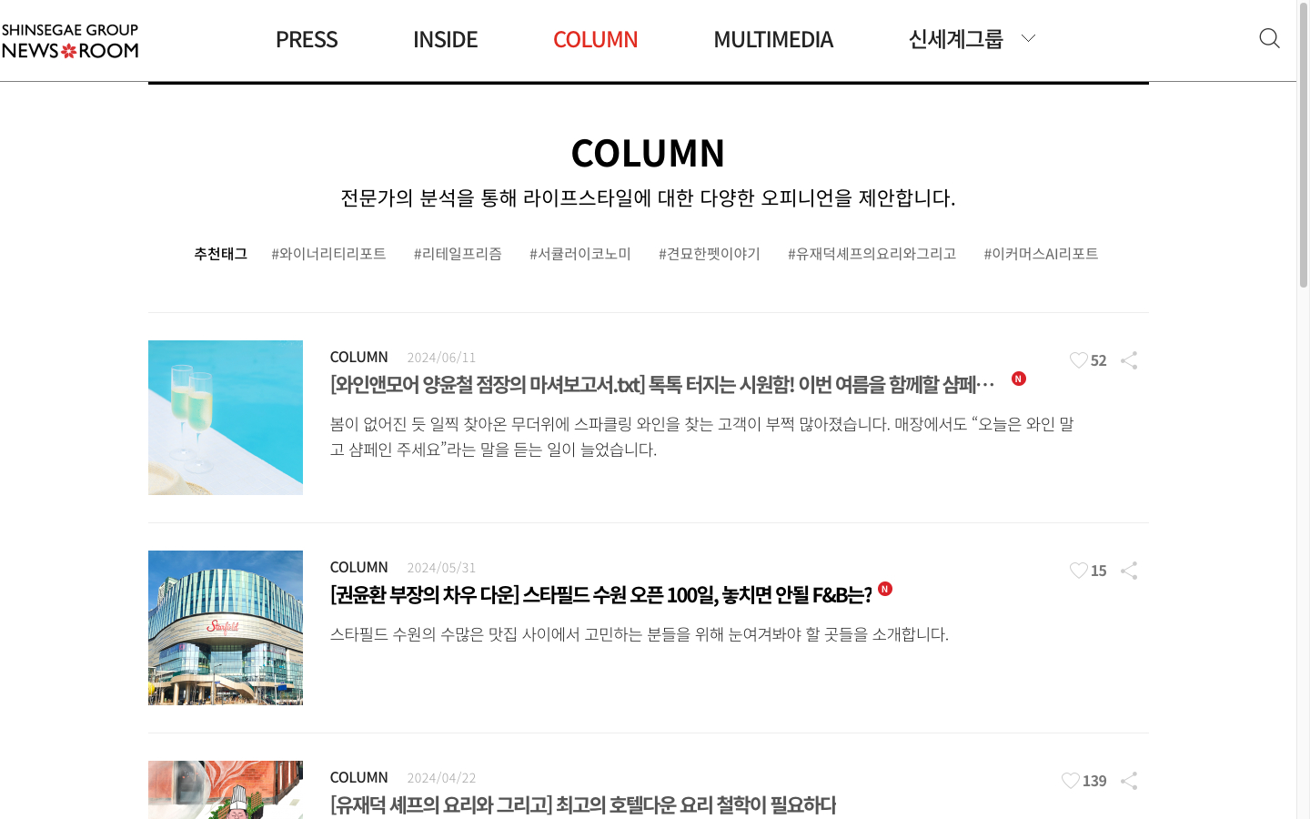 COLUMN 메뉴는 전문가의 분석을 통해 라이프스타일에 대한 다양한 오피니언을 제안하는 공간입니다. ‘와이너리티리포트’, ‘리테일프리즘’, ‘서큘러이코노미’, ‘견묘한펫이야기’, ‘유재덕셰프의 요리와 그리고’, ‘이커머스AI리포트’ 등의 추천 태그를 사용하여 전문적인 시각과 인사이트를 제공합니다. 이 메뉴는 신세계그룹이 바라보는 트렌드와 미래에 대한 통찰을 독자들에게 전달하는 것을 목표로 합니다.