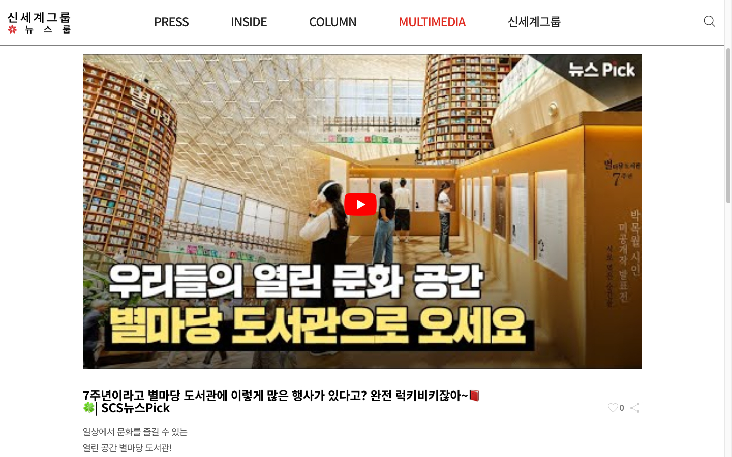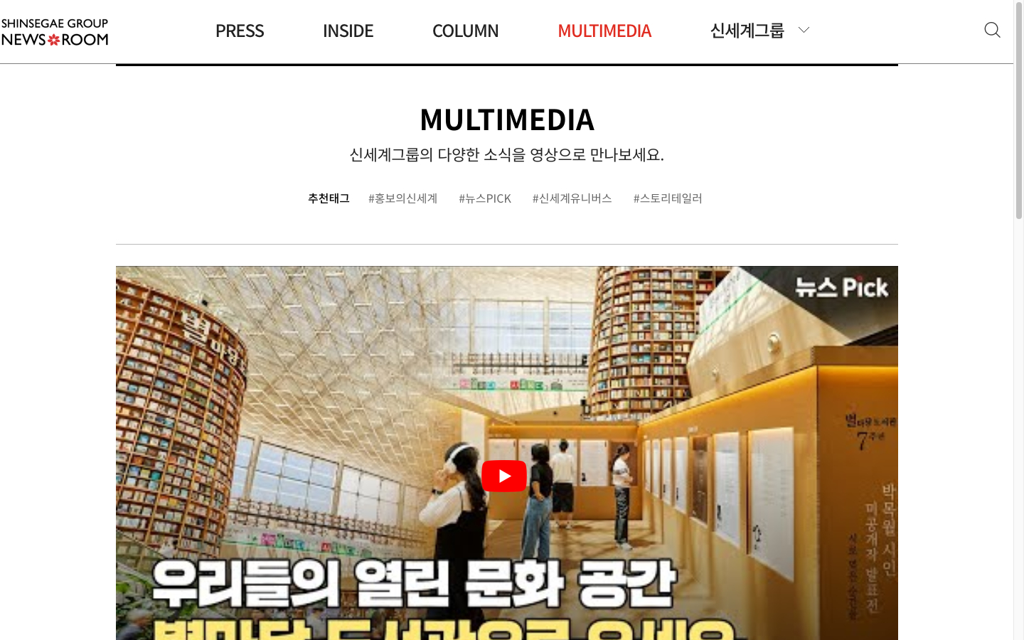 MULTIMEDIA 메뉴는 신세계그룹의 다양한 소식을 영상으로 제공하는 섹션입니다. ‘홍보의 신세계’, ‘뉴스PICK’, ‘신세계 유니버스’, ‘스토리텔러’ 등의 추천 태그를 통해 다양한 영상을 제공하여 시각적 콘텐츠를 선호하는 독자들에게 맞춤형 정보를 전달합니다. 이 메뉴는 생동감 있는 영상 콘텐츠로 신세계그룹의 활동과 이야기를 더욱 생생하게 전달합니다.