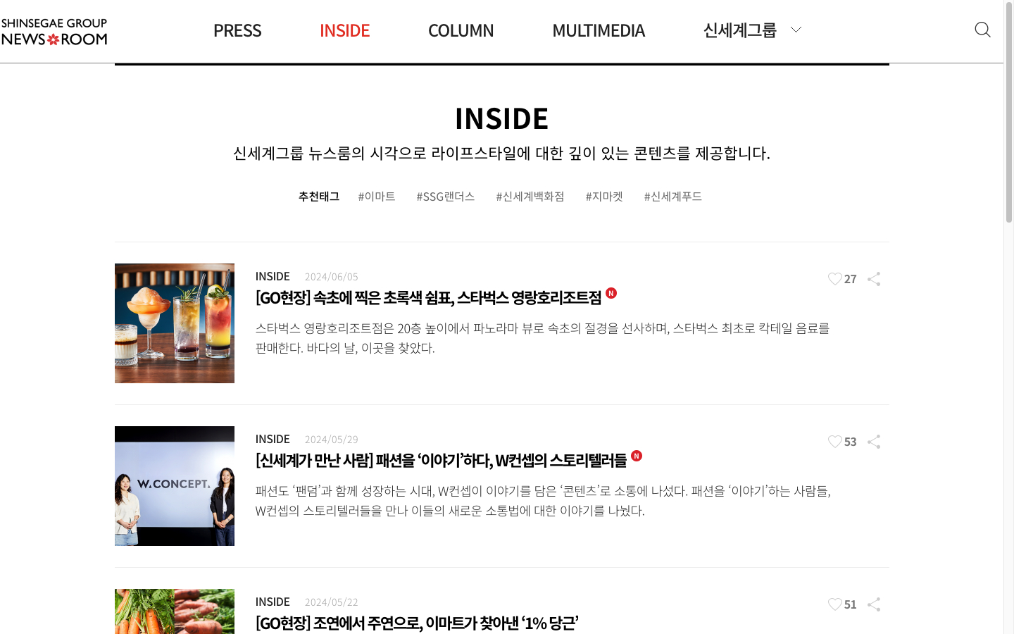 INSIDE 메뉴는 신세계그룹 뉴스룸의 시각으로 라이프스타일에 대한 깊이 있는 콘텐츠를 제공하는 공간입니다. ‘이마트’, ‘SSG랜더스’, ‘신세계백화점’, ‘지마켓’, ‘신세계푸드’ 등의 추천 태그를 통해 다양한 라이프스타일 트렌드와 신세계그룹의 내부 소식을 심층적으로 다룹니다. 이 메뉴는 신세계그룹의 브랜드와 서비스가 어떻게 일상 생활에 녹아들고 있는지를 보여줍니다.