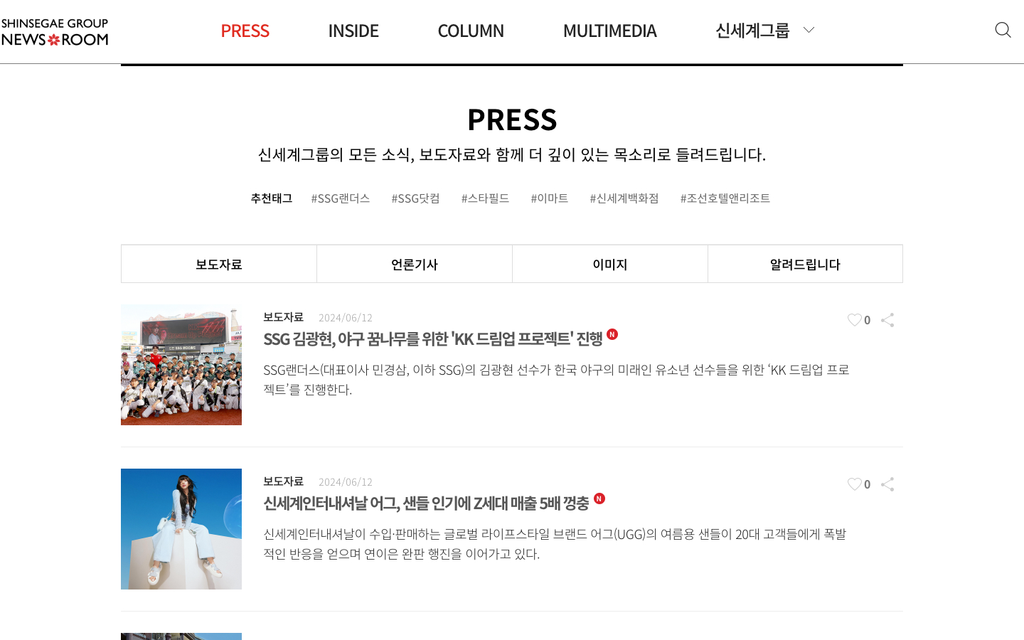 PRESS 메뉴는 신세계그룹의 모든 소식과 보도자료를 다루며, 더 깊이 있는 목소리로 정보를 제공합니다. 이 섹션은 보도자료, 언론기사, 이미지, 공지사항 등 다양한 콘텐츠로 구성되어 있습니다. ‘SSG랜더스’, ‘SSG닷컴’, ‘스타필드’, ‘이마트’, ‘신세계백화점’, ‘조선호텔앤리조트’ 등의 태그를 추천하여 관련된 최신 소식과 정보를 쉽게 찾을 수 있도록 합니다. 이 메뉴는 신세계그룹의 공식 발표와 뉴스를 통해 회사의 주요 활동과 이벤트를 투명하게 전달하는 데 중점을 둡니다.