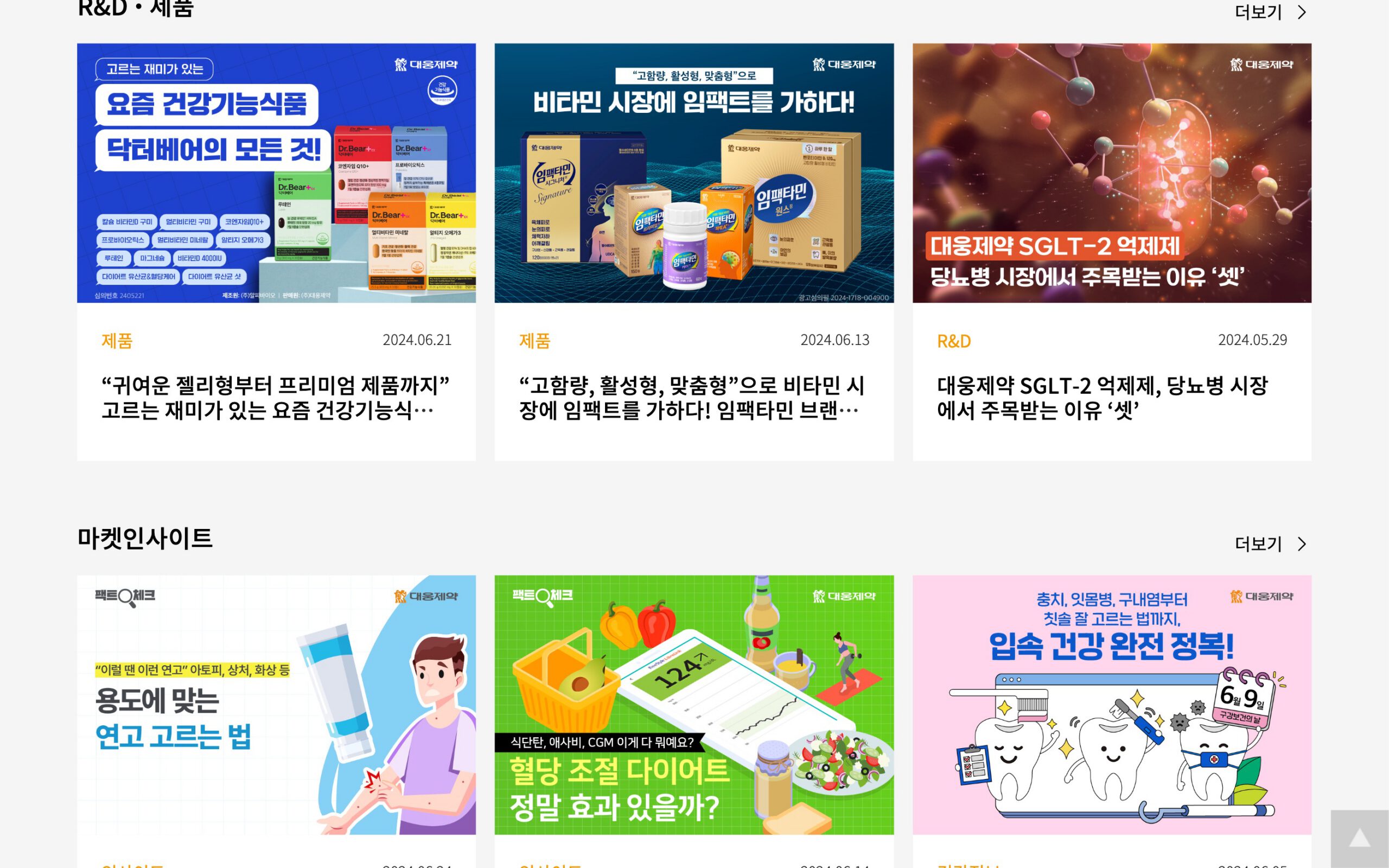 기업뉴스는 다양한 회사 소식을 전달하는 콘텐츠로 구성되며, 카드 형식의 뉴스 리스트를 통해 시각적으로 깔끔하고 가독성을 높였습니다. 이 섹션은 대웅제약의 최신 소식과 주요 활동을 쉽게 확인할 수 있도록 도와줍니다.