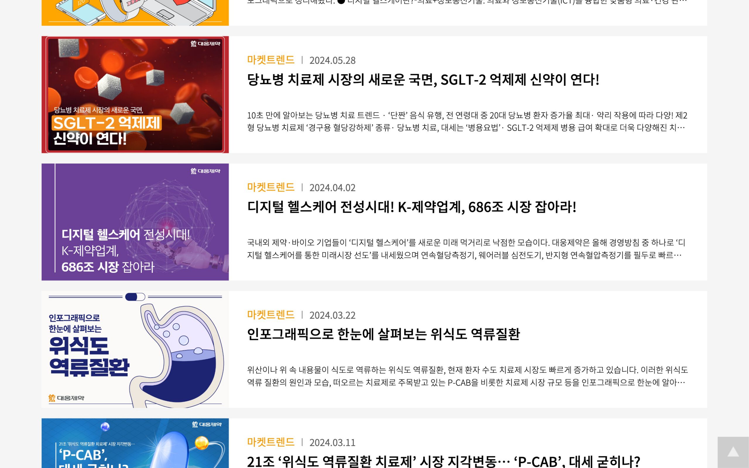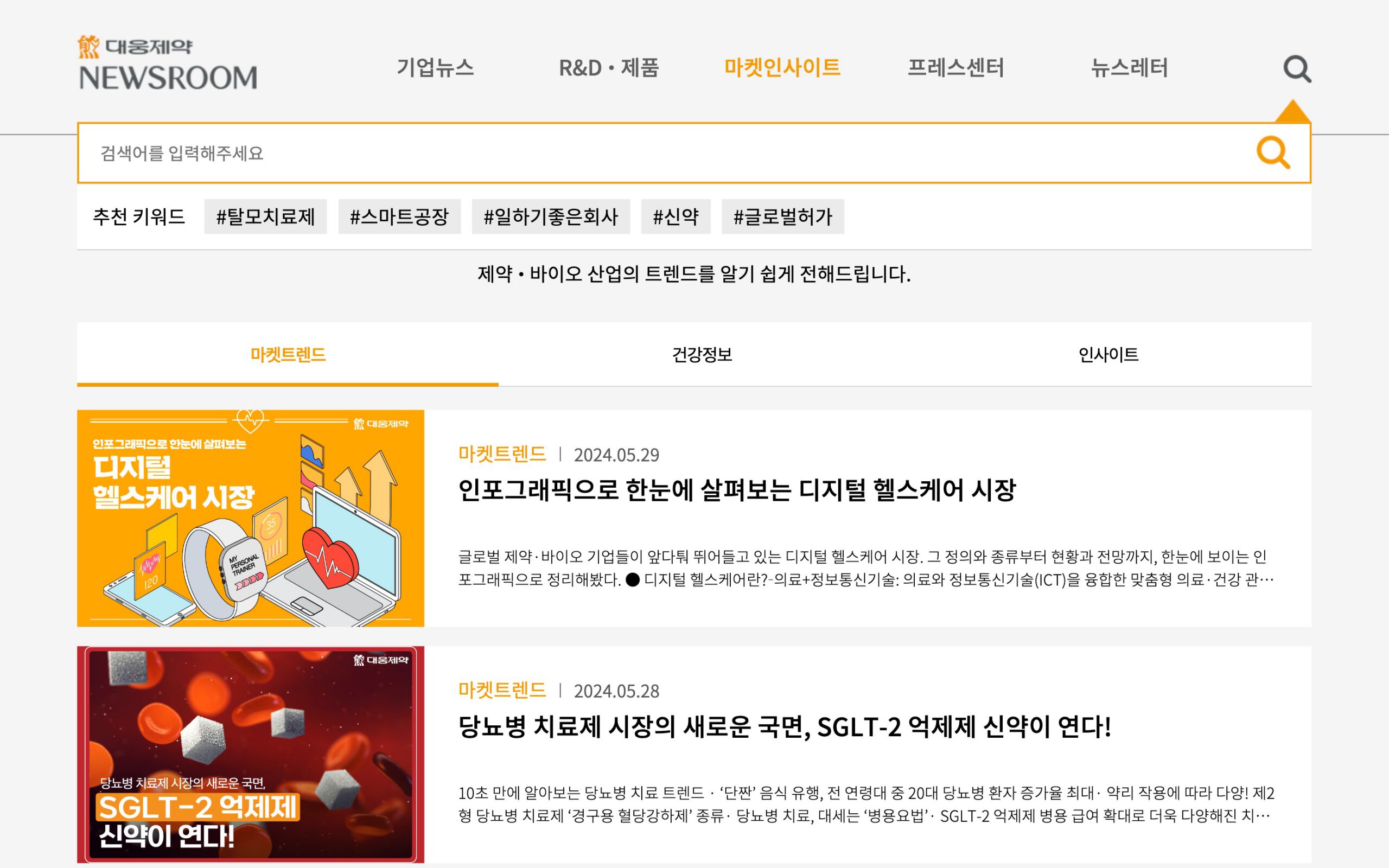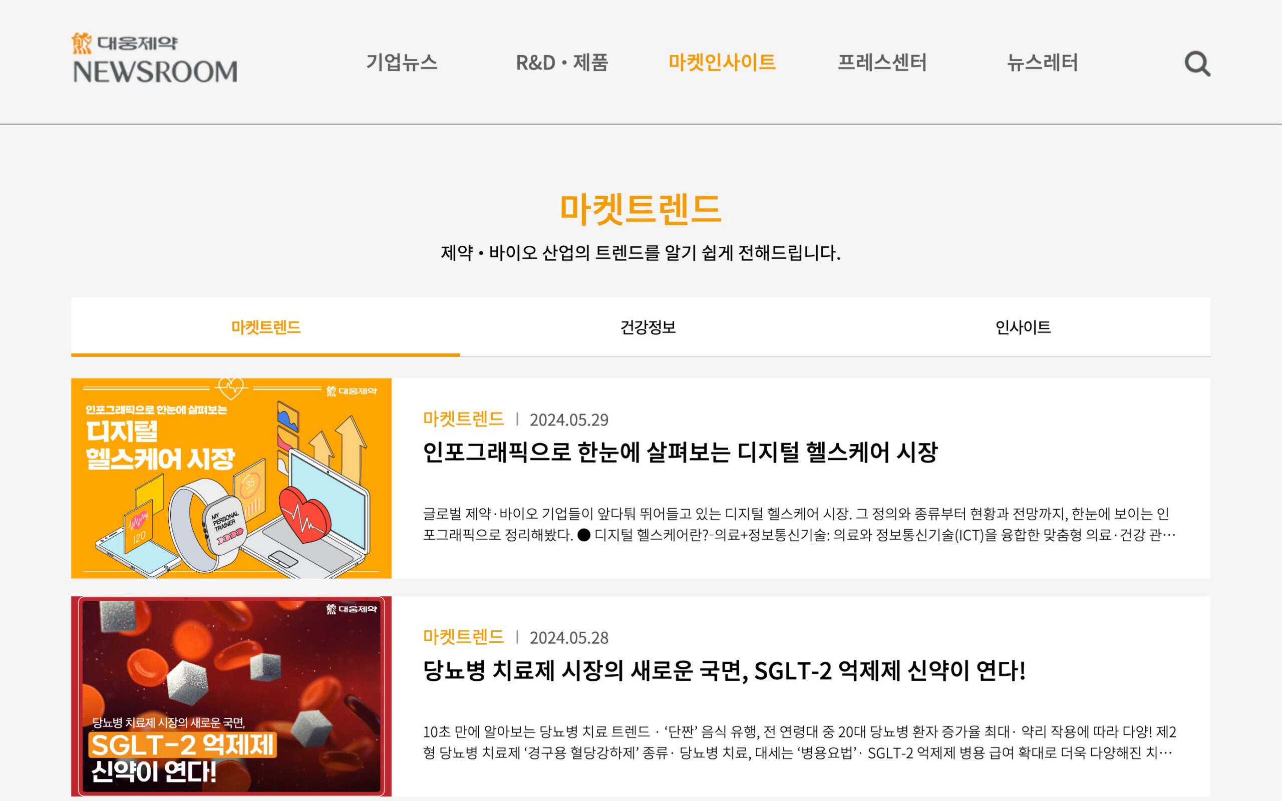 마켓인사이트 섹션은 마켓 트렌드, 건강 정보, 인사이트로 구성되어 있습니다. 이 섹션에서는 제약 및 바이오 산업의 최신 트렌드와 건강 관련 정보를 제공하며, 전문가들의 인사이트를 통해 시장 동향을 파악할 수 있도록 합니다. 이를 통해 독자들이 업계의 최신 동향을 이해하고, 건강에 대한 유용한 정보를 얻을 수 있습니다.