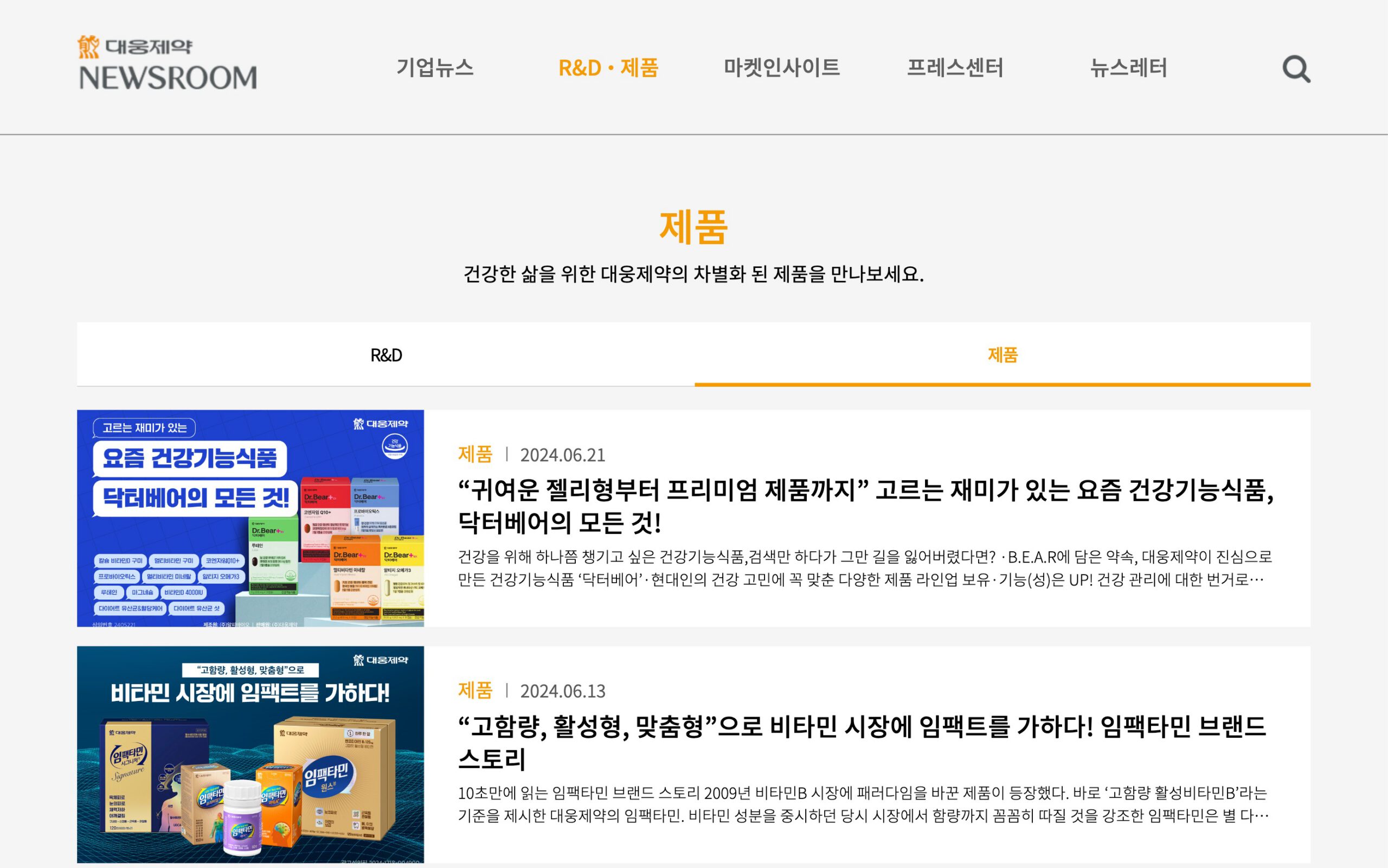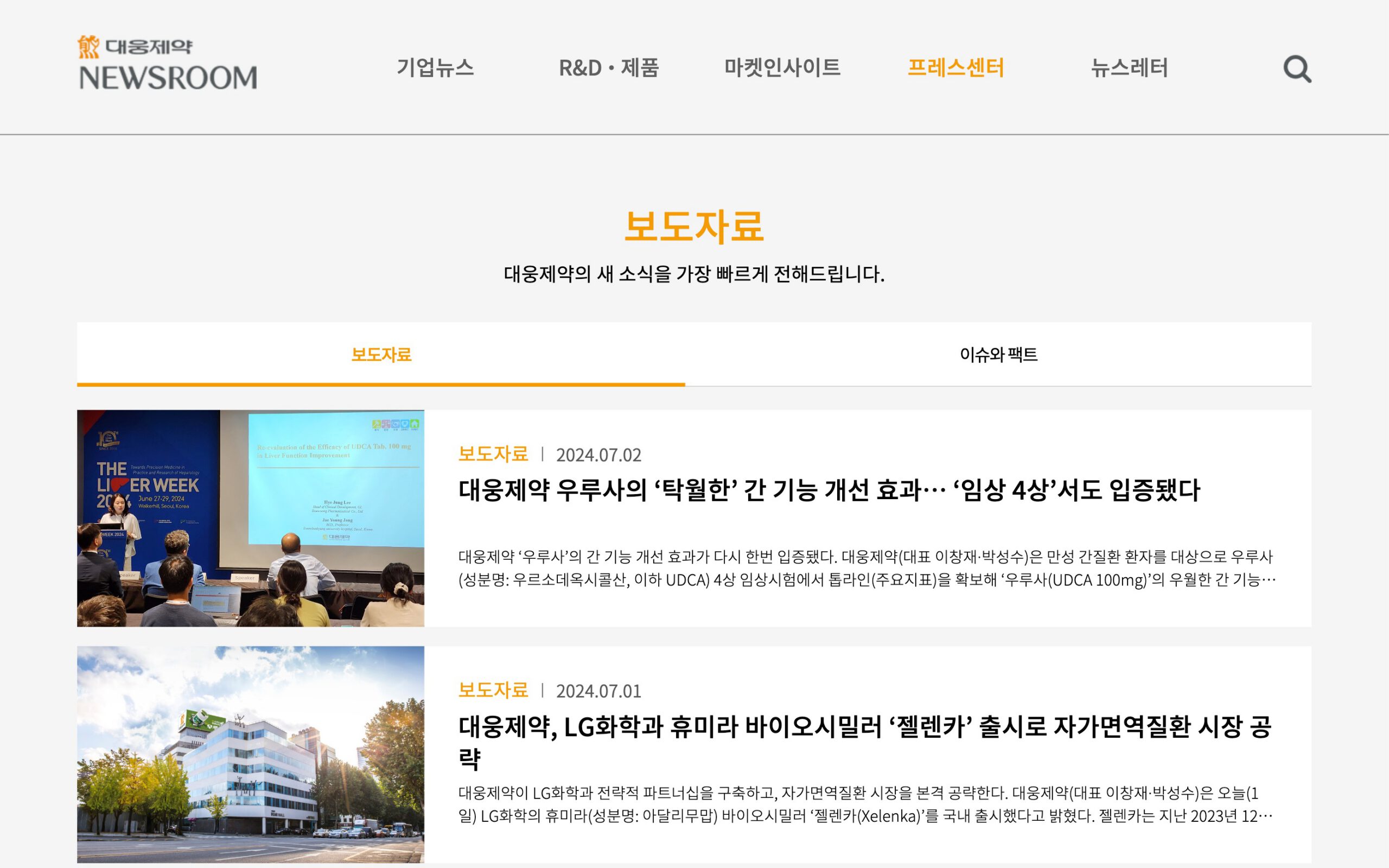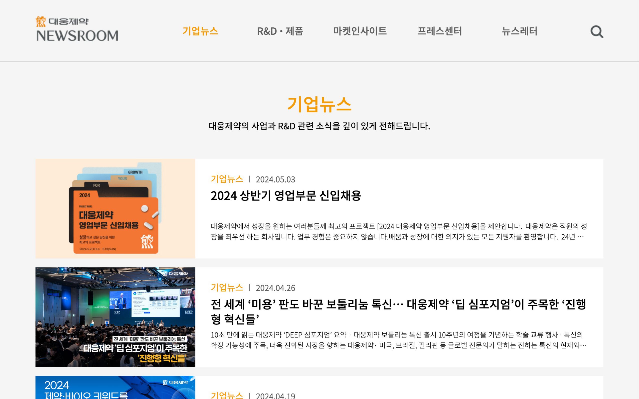 대웅제약 뉴스룸은 기업뉴스, R&D.제품, 마켓인사이트, 프레스센터, 뉴스레터로 구성되어 있습니다.