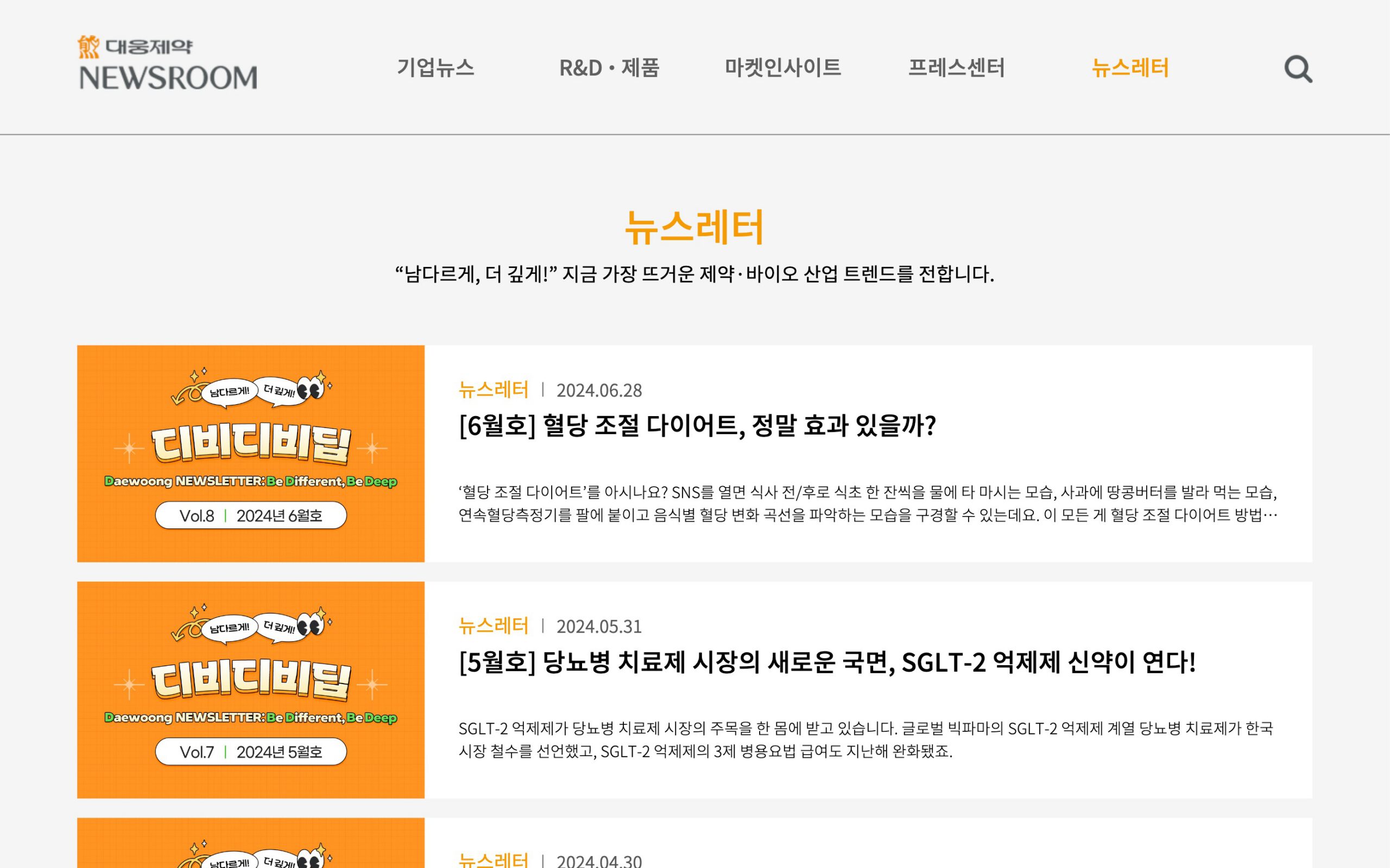뉴스레터 서비스는 네비게이션 바에 위치하고 있어 사용자들이 쉽게 접근할 수 있습니다. 뉴스레터는 구독자들에게 최신 정보를 정기적으로 제공하며, 구독하기 외에도 다양한 내용을 확인할 수 있습니다. 이를 통해 사용자들은 대웅제약의 최신 소식을 놓치지 않고 받아볼 수 있습니다.