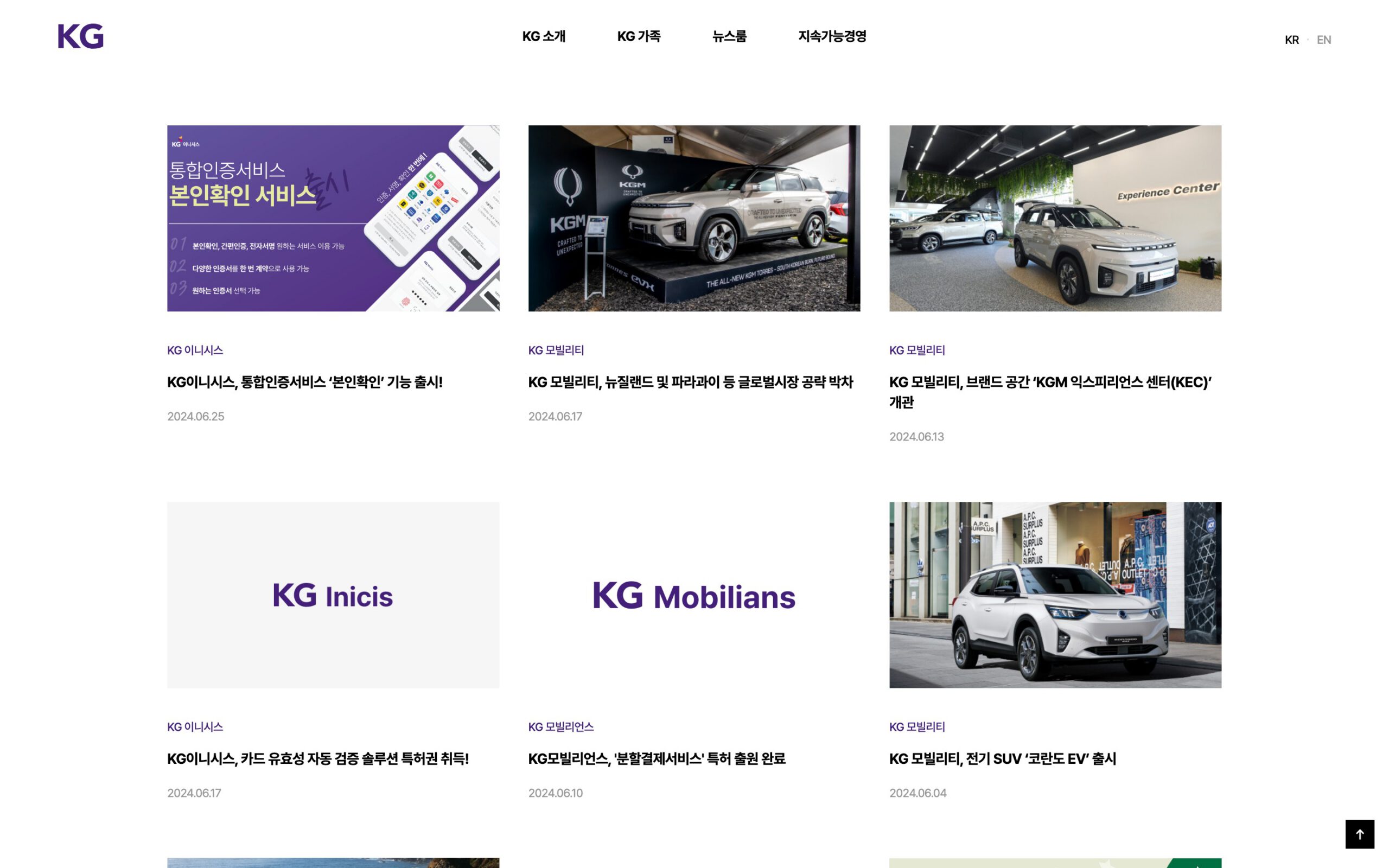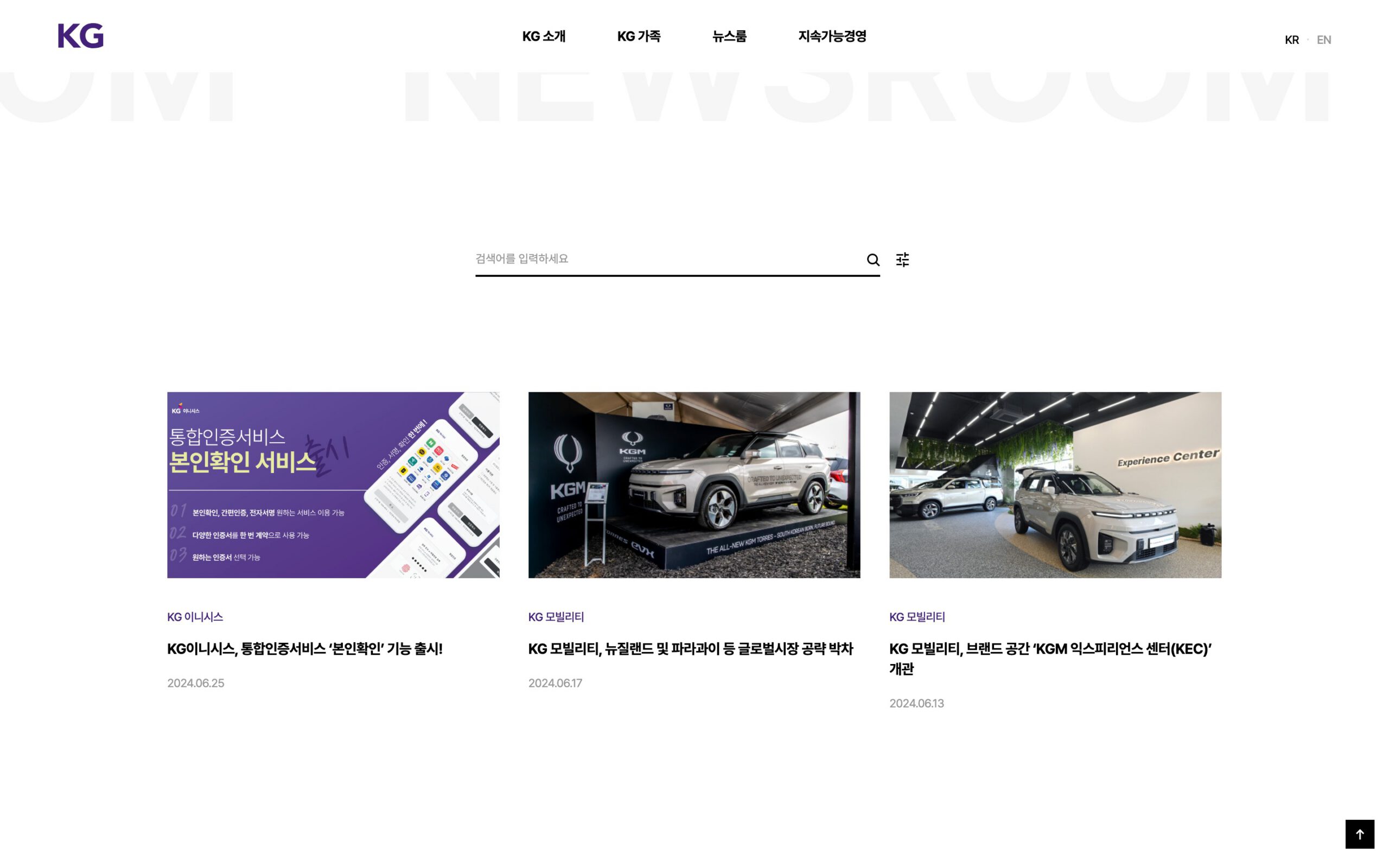KG모빌리티 뉴스룸의 화면 디자인은 현대적이고 사용자 친화적인 요소들로 구성되어 있습니다. 사이트 내 글 목록 아이템은 모두 그리드 스타일(카드타입)로 구성되어 있어, 시각적 매력을 높이고 정보 접근성을 향상시킵니다. 각 카드에는 이미지, 제목, 요약 텍스트, 게시 날짜가 포함되어 있어, KG모빌리티의 다양한 뉴스를 한눈에 볼 수 있습니다.