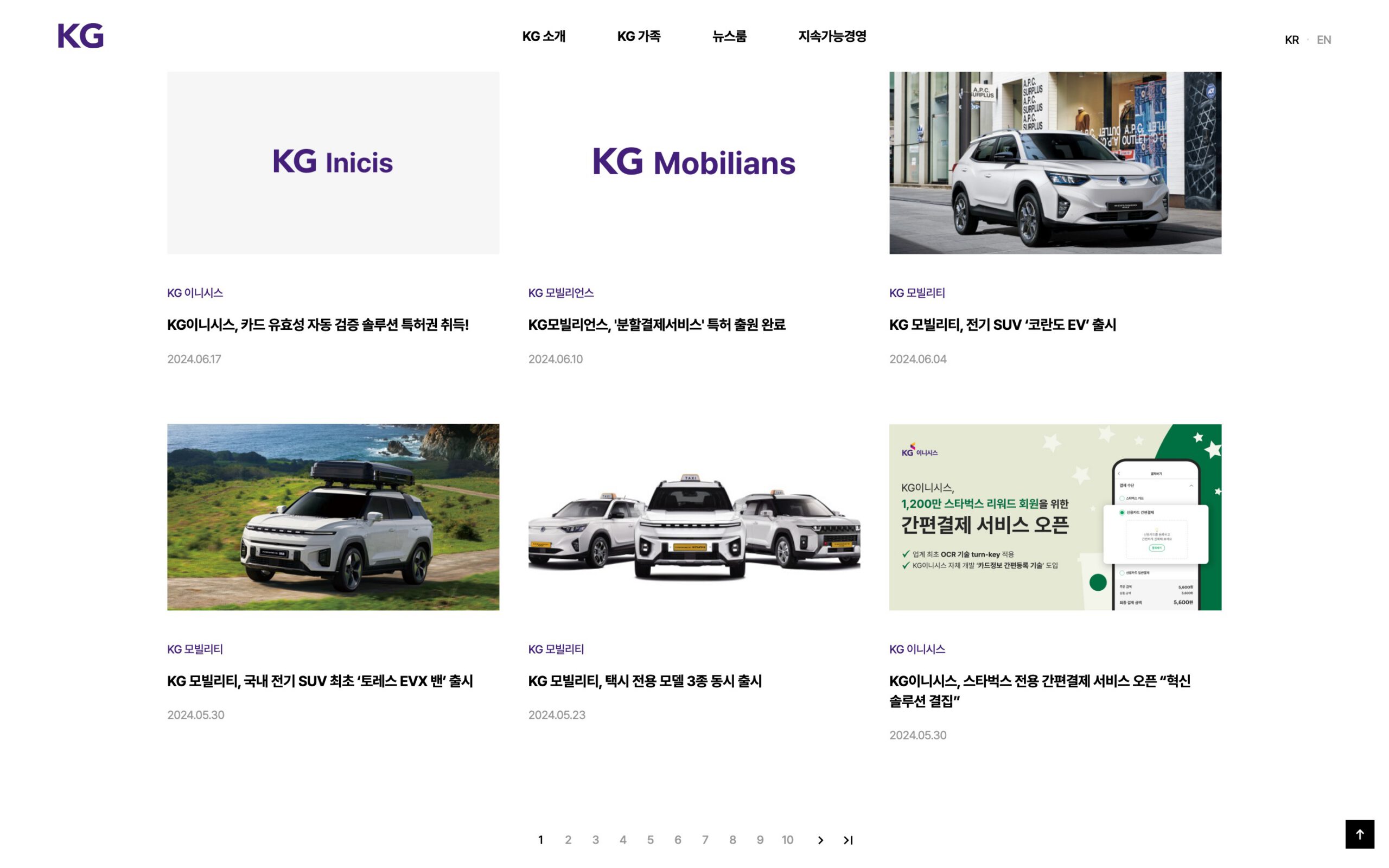 KG모빌리티 뉴스룸의 기사 목록 화면은 페이지 헤더, 글 목록, 페이지네이션으로 구성되어 있습니다. 페이지 헤더에는 뉴스룸 로고와 네비게이션 메뉴가 포함되어 있어 주요 섹션으로 쉽게 이동할 수 있습니다. 글 목록은 이미지와 요약 텍스트가 포함된 카드 형식으로 구성되어, 시각적 효과와 가독성을 동시에 제공합니다. 페이지네이션은 하단 중간에 위치하여 사용자가 쉽게 페이지를 탐색할 수 있도록 설계되어 있습니다. 이 구성은 사용자가 필요한 정보를 빠르고 편리하게 찾을 수 있도록 돕습니다.