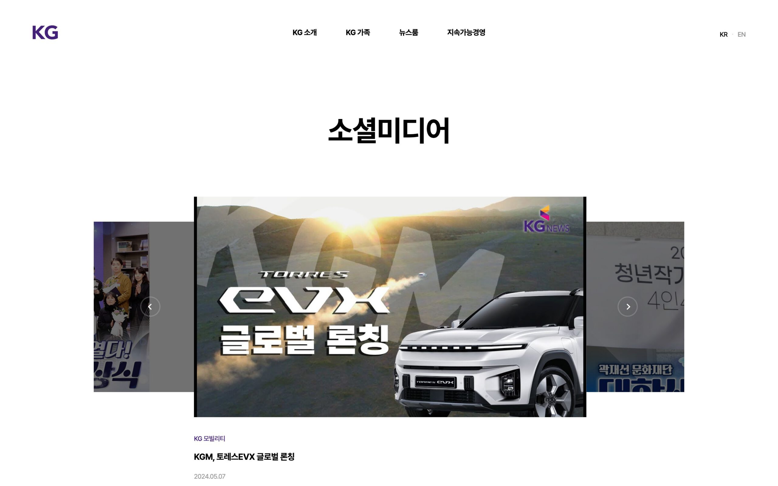 소셜미디어 섹션은 KG모빌리티의 다양한 소셜미디어 채널을 통합하여 보여줍니다. 페이스북, 유튜브 등 다양한 플랫폼을 통해 회사의 소식과 콘텐츠를 실시간으로 공유하며, 사용자와의 소통을 강화합니다. 이 섹션은 KG모빌리티가 디지털 시대에 맞춰 다양한 소셜 채널을 통해 다각적인 소통을 시도하고 있음을 나타냅니다.
