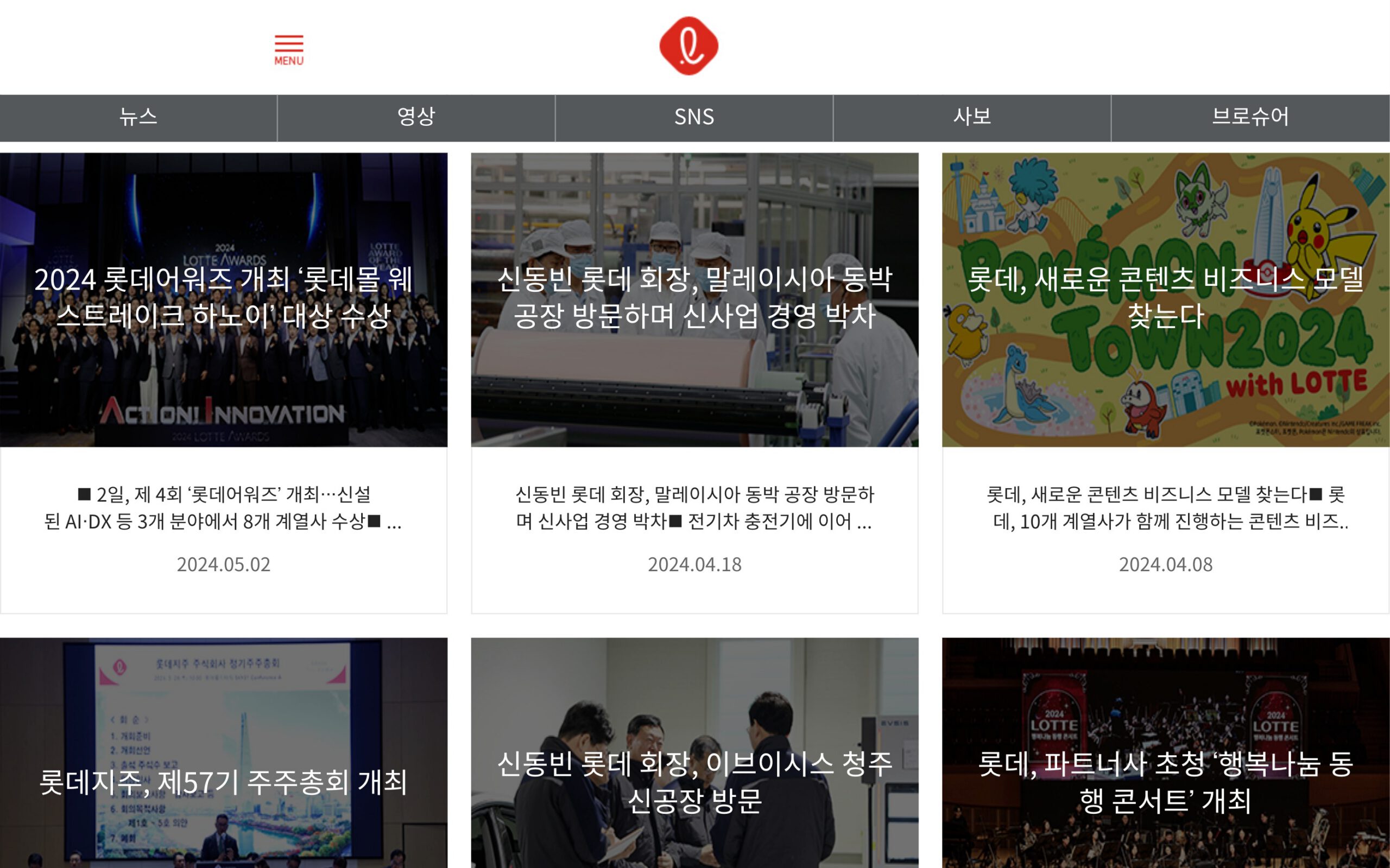 롯데그룹 뉴스룸의 화면 디자인은 사용자 중심의 직관적이고 시각적으로 매력적인 레이아웃을 자랑합니다. 사이트 내 글 목록 아이템은 모두 그리드 스타일(카드타입)로 구성되어 있으며, 각 카드에는 이미지, 제목, 요약 텍스트, 게시 날짜가 포함되어 있어 시각적 매력을 높이고 정보 접근성을 향상시킵니다.