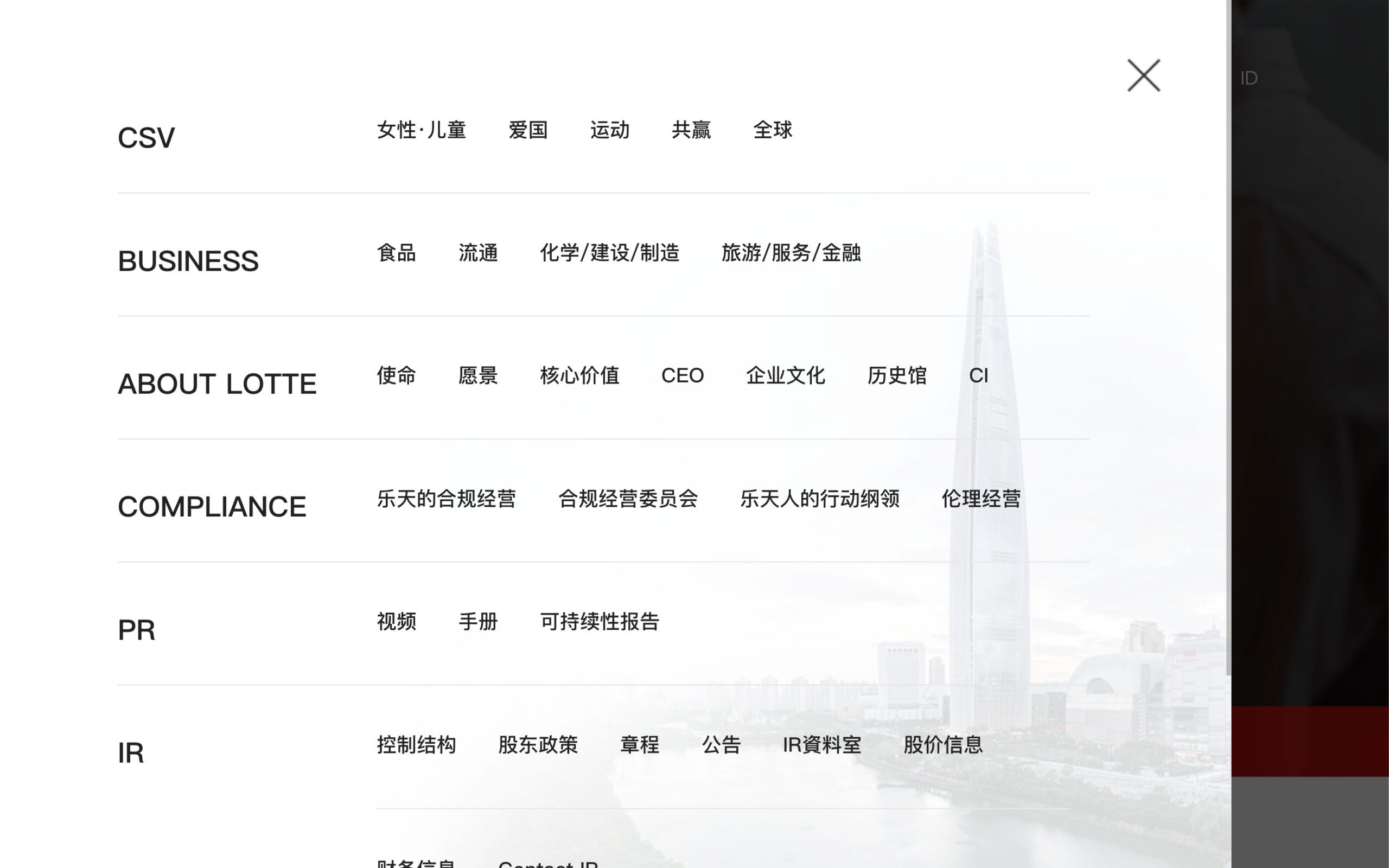 레이아웃은 상단 헤더와 하단 푸터로 구분되어 있습니다. 상단 헤더의 좌측에는 네비게이션 드로어가 위치하여 사용자가 사이트의 다양한 섹션으로 쉽게 이동할 수 있게 합니다. 중앙에는 홈버튼이 배치되어 언제든지 메인 페이지로 돌아갈 수 있으며, 우측에는 다국어 버튼이 있어 한국어, 영어, 중국어, 일본어, 베트남어, 인도네시아어 등 여러 언어로 사이트를 이용할 수 있게 합니다. 이러한 다국어 지원은 롯데의 글로벌 접근성을 반영합니다. 하단 푸터에는 개인정보처리방침, SNS 링크, 드롭다운 메뉴 등이 포함되어 있어 사용자 편의성을 높이며, 회사의 신뢰성을 강조합니다.