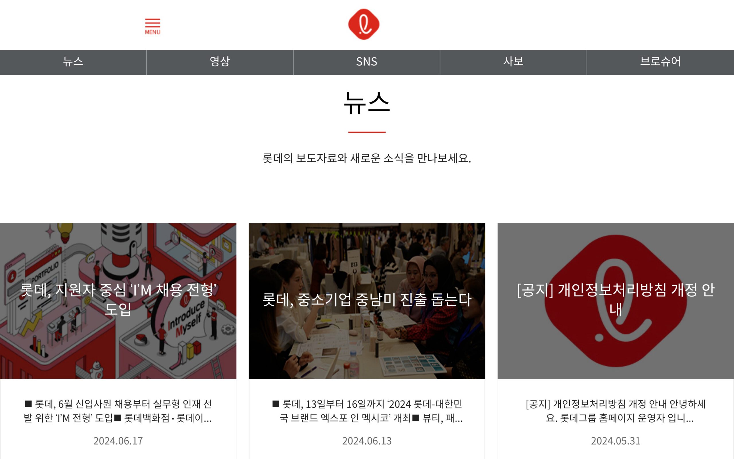 롯데 뉴스룸은 다양한 콘텐츠를 통해 기업의 최신 소식과 활동을 전달하는 데 중점을 두고 있습니다. 뉴스룸은 사용자들이 롯데의 여러 활동과 성과를 쉽게 접근하고 이해할 수 있도록 여러 가지 섹션으로 구성되어 있습니다. 주요 메뉴는 뉴스, 영상, SNS, 사보, 브로슈어로 나뉘어 있습니다.