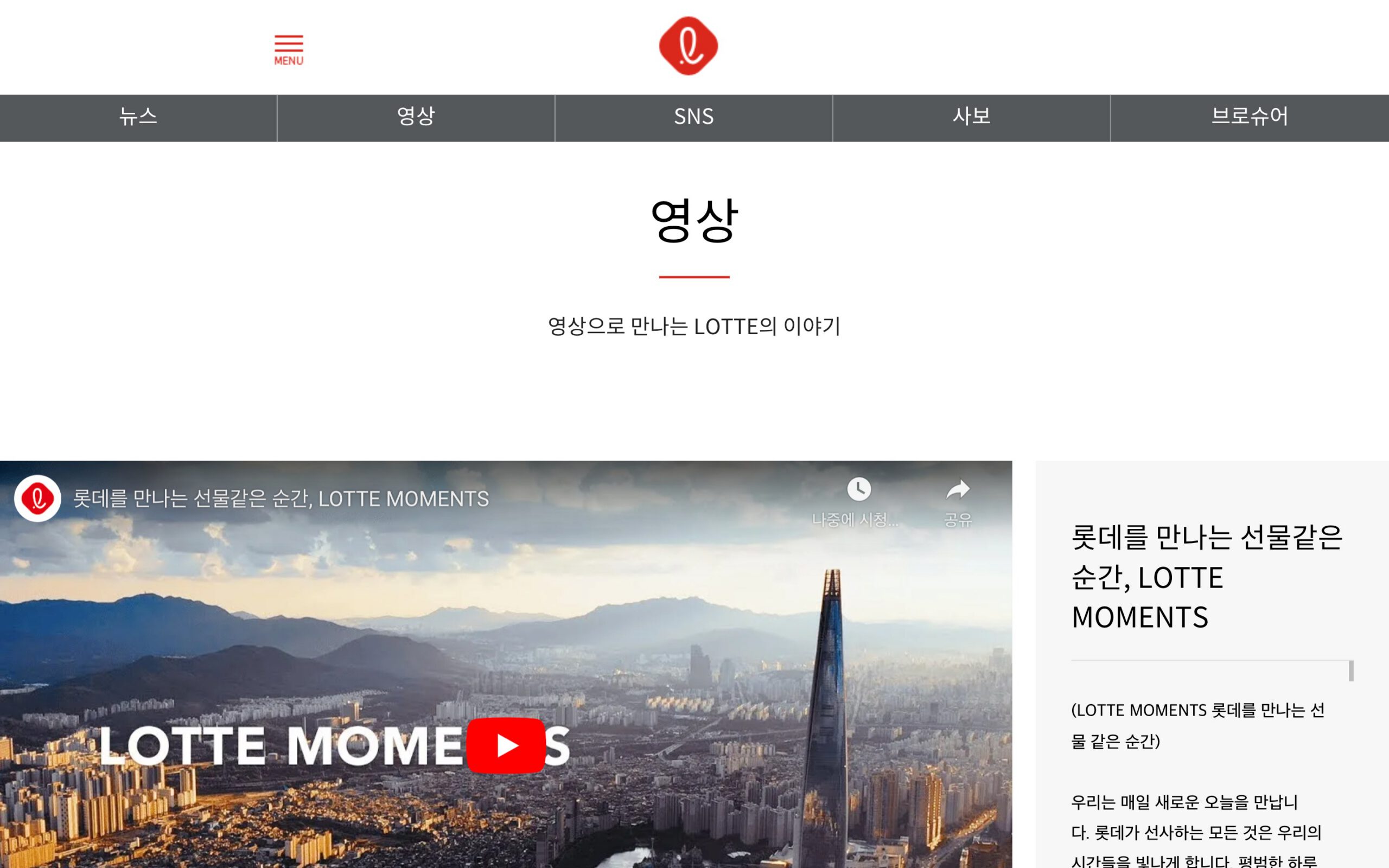 “영상” 섹션에서는 다양한 홍보 및 정보 영상을 통해 롯데의 활동과 이벤트를 시청할 수 있습니다. 롯데의 비전, 미션, 기업 문화를 시각적으로 경험할 수 있도록 돕는 이 섹션은 시청각적 콘텐츠를 통해 메시지를 효과적으로 전달합니다. 이를 통해 사용자는 롯데의 다채로운 활동을 더 생생하게 느낄 수 있습니다.