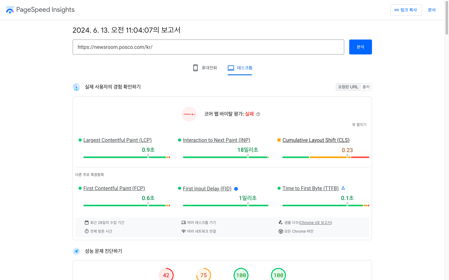 포스코 뉴스룸은 최신 기술을 활용하여 웹사이트의 성능과 사용자 경험을 최적화하고 있습니다. Google 페이지스피드 분석에 따르면, LCP(최대 콘텐츠 표시 시간)는 0.9초로 로딩 속도에는 문제가 없지만, 레이아웃 변경에 해당하는 CLS 점수가 낮아 프론트엔드 코드 상에 개선이 필요해 보입니다. 이는 사용자 경험을 향상시키기 위해 중요한 요소로, 향후 업데이트가 필요할 것입니다.