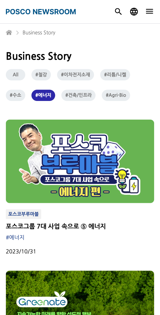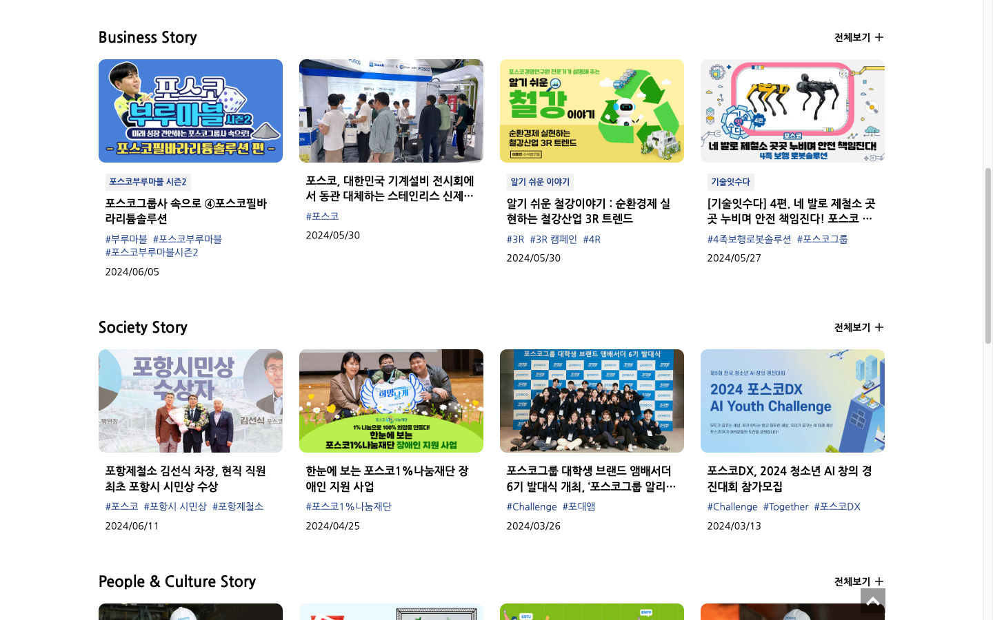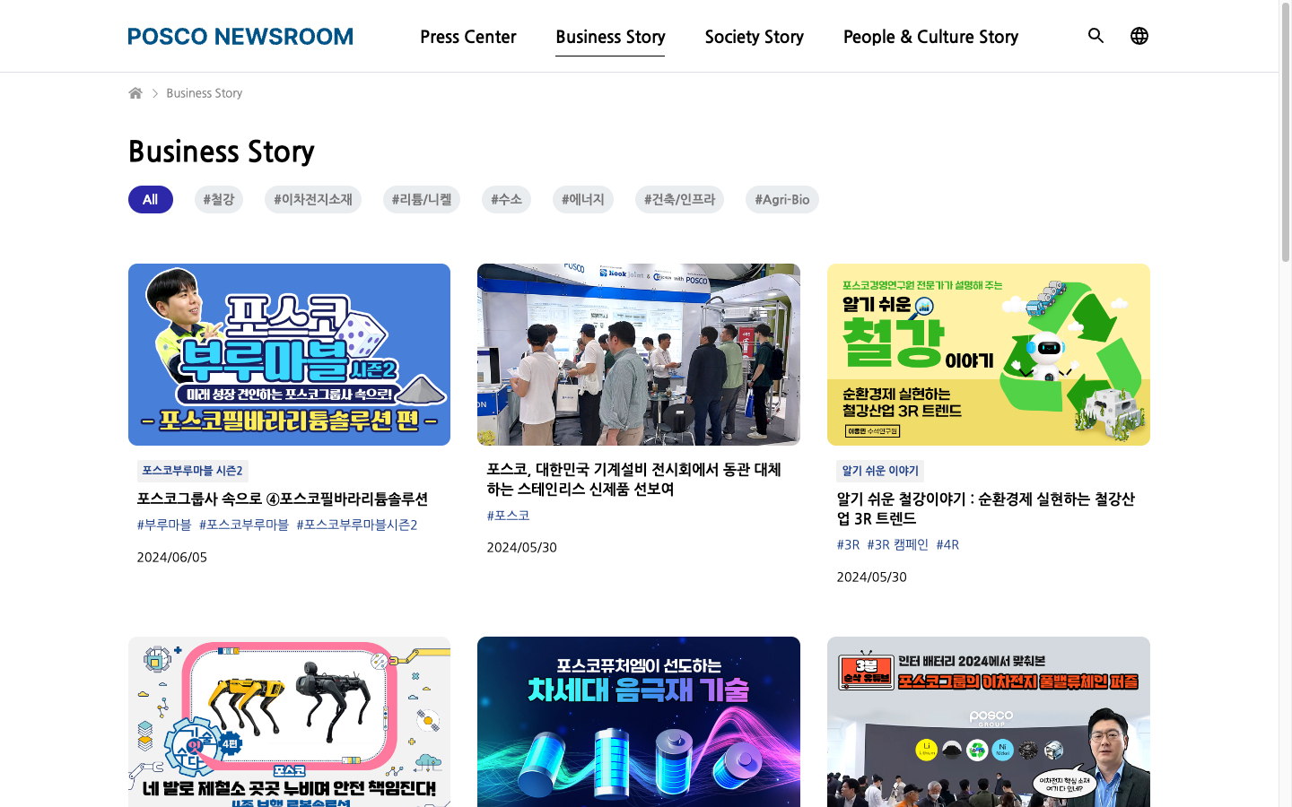 Business Story 섹션은 포스코그룹의 사업에 대한 최신 뉴스로 가득 차 있습니다. 이곳에서는 철강, 이차전지 소재, 리튬/니켈, 수소 등 포스코그룹의 핵심 사업 분야에서의 경쟁력을 확인할 수 있습니다. 이를 통해 독자들은 포스코그룹이 각 사업 분야에서 어떤 전략을 취하고 있으며, 어떤 성과를 이루고 있는지를 자세히 알 수 있습니다.