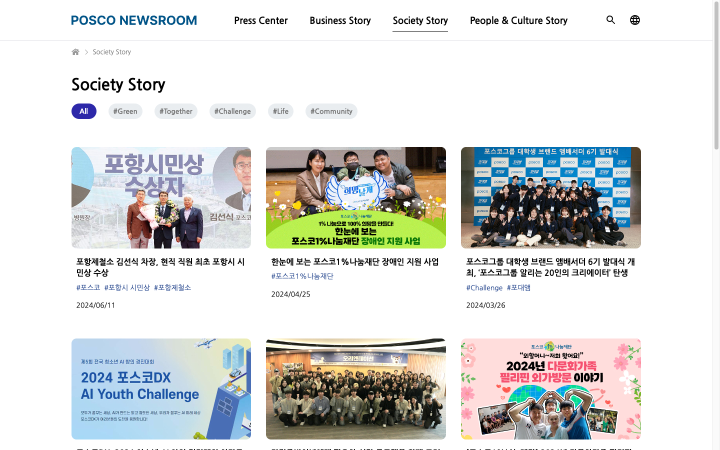 Society Story는 포스코그룹의 CSR(기업의 사회적 책임) 활동을 소개하는 공간입니다. 이 섹션에서는 포스코그룹이 사회의 일원으로서 공존과 공생의 가치를 실현하기 위해 어떤 노력을 기울이고 있는지 다양한 활동들을 통해 전달합니다. 이는 포스코그룹이 단순히 기업의 이익을 추구하는 것에 그치지 않고, 사회적 책임을 다하는 기업으로서의 모습을 강조합니다.